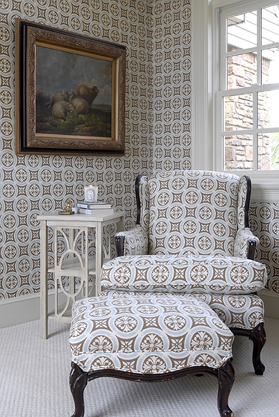 I've always been wary of matching upholstery to curtains (or to wallpaper). For one, the practice strikes me as dated, having generally gone out of vogue around the time the first George Bush left office. But, as with fashion, what goes around invariably comes back around in the world of interiors -- and, as we all know the 1980s are back. And so, I'm starting to rethink my traditional bias. In the right hands (and with the right pattern), matching patterns on walls, windows, and/or furniture can make a bold, confident statement.