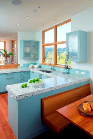 A more modern take on a blue kitchen. I absolutely adore the (Silestone?) countertops and backsplash. The reddish tones in the natural wood floors and trim are a great contrast to the stainless steal and the cool blue of the cabinets.