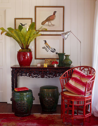 The genius of Miles Redd is that he takes very traditional design elements -- even "granny-ish" elements -- and makes them feel young, hip and new. I absolutely love the sink/faucet in this bathroom, but of course it's Scalamadre "Zebra" wallpaper that really steals the show.