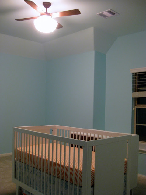 Yay! 3 cheers for blue nursery walls! They look great, especially with the orange. Smart move to bring in the professionals:)