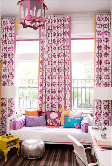 Amanda Nisbet is one of those designers whose work just makes me smile -- and this teen bedroom is no exception. The hot pink is girly and youthful, but not babyish (very important when you're 14 and trying so very hard to be grown-up!). I particularly love the floor to ceiling drapes in hot pink and coordinating lantern.